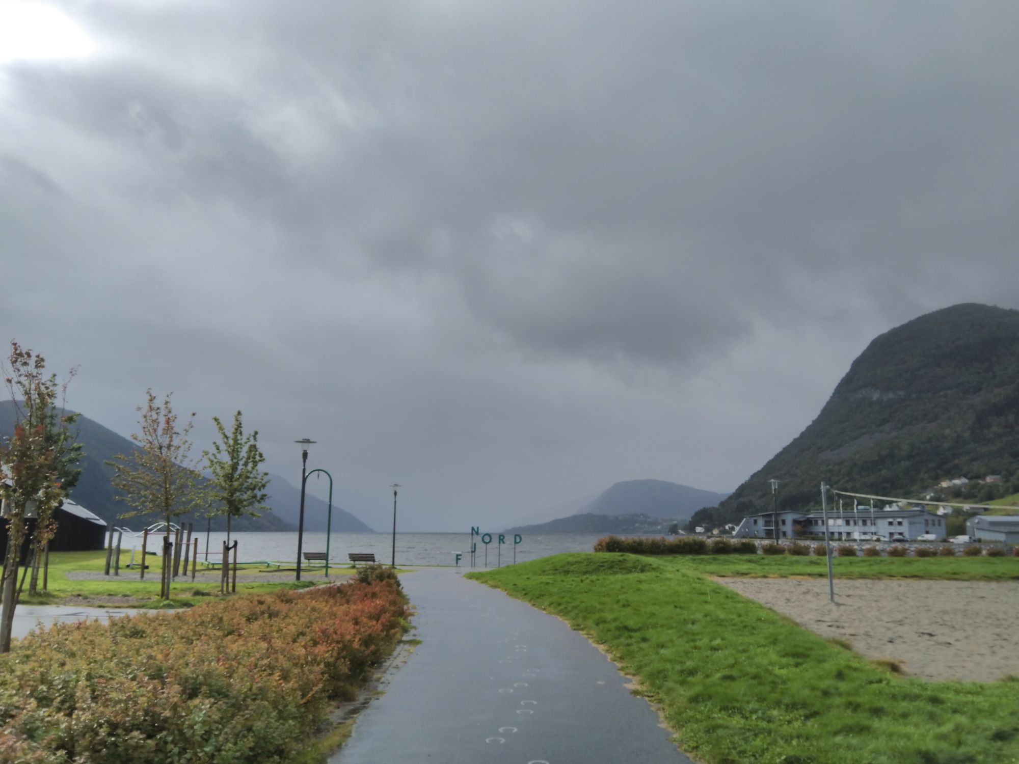 In het stadje Nordfjordeid hebben we twee keer op de parkeerplaats bij het kustparkje van de stad gestaan. Handig dat er toiletten waren - in de stad kun je niet zomaar even een kuiltje graven en op de hurken gaan zitten. De tweede keer bleek er een soort feestdag te zijn in de stad: er waren allerlei activiteiten georganiseerd. Wij dachten: dit is hét moment om te zien wat er leeft in de stad. Maar het was slecht weer, de mensen van het aangekomen cruiseschip leken toch vooral aan boord te blijven ... voor ons stadsmensen was het verschil met een 'gewone' dag miniem. Wel zijn we naar een orgelconcert geweest in het centrale kerkje. En daar hadden we een leuke ontmoeting: de organist en zijn vrouw kwamen uit Engeland. Zij nodigden ons uit om een keer te komen eten, en verbonden ons de paar dagen erna met allerlei anderen, waaronder iemand die ook een plek had waar we zouden kunnen overwinteren. Ook daar gaan we volgende week kijken.