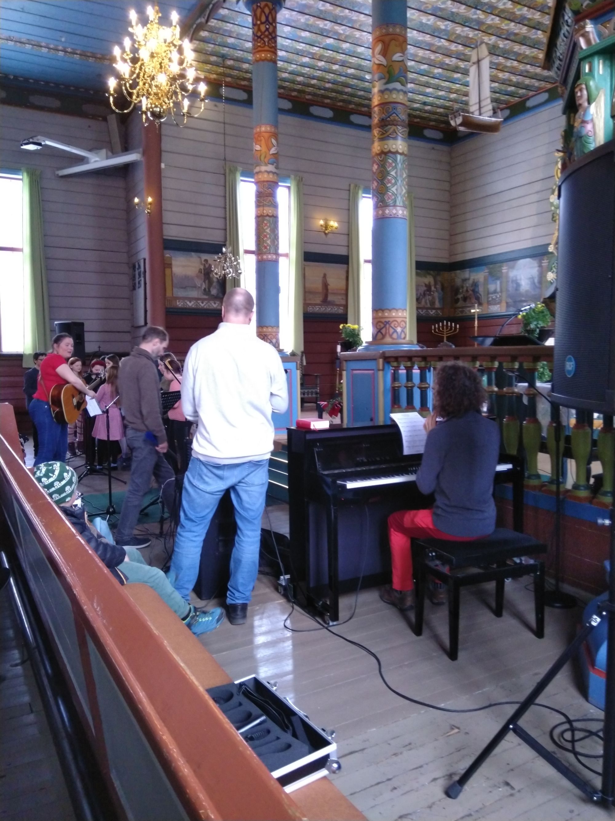 Piano spelen bij het kinderkoor in de lokale kerk. Uitzicht vanuit ons raam, de vlag hangt uit met pasen.