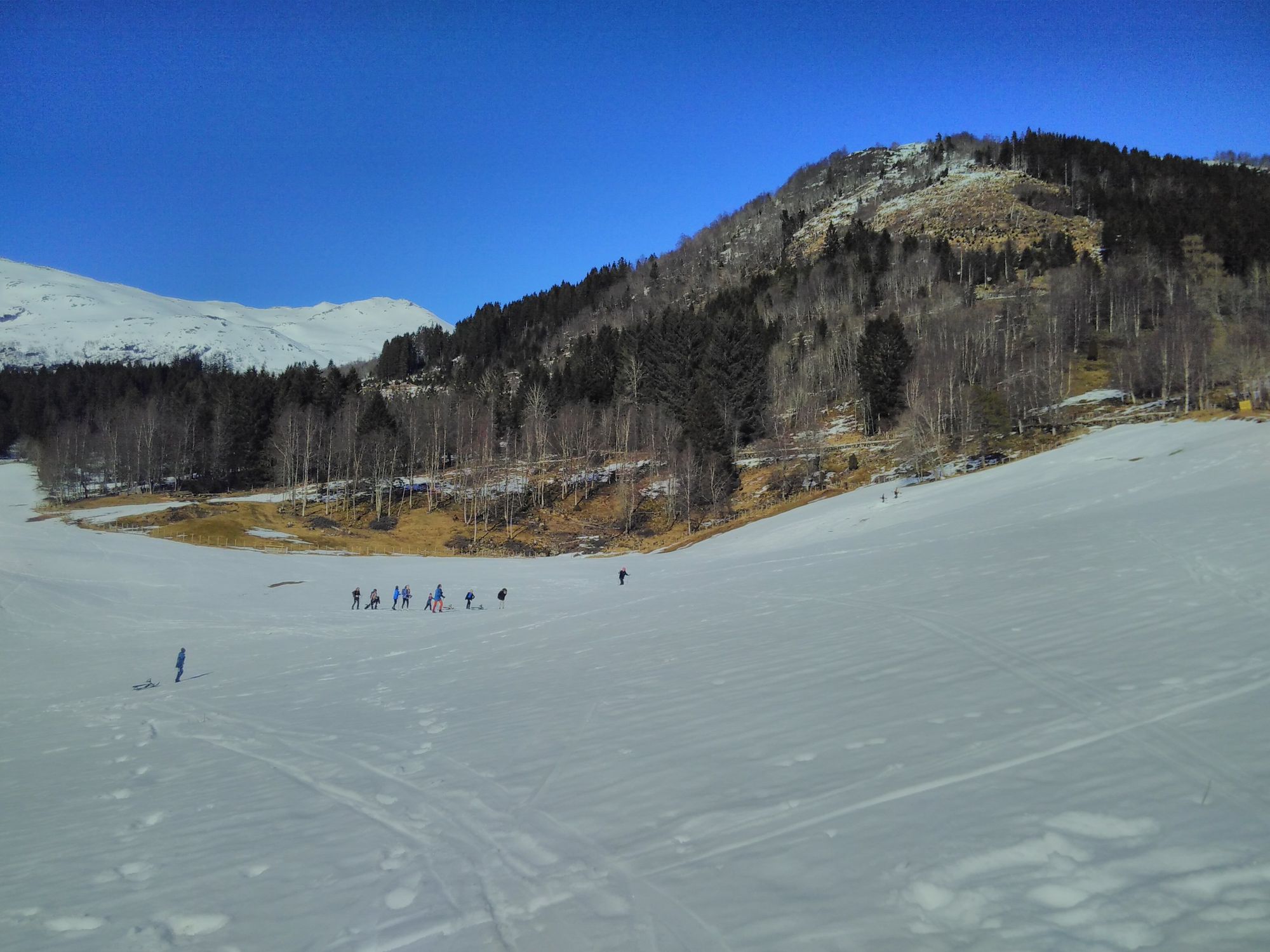 Langzaam wordt het hier lente. Dat gebeurt ietsje later dan we gewend zijn: met pasen was er nog sneeuw, en slechts voorzichtig kwam er af en toe een bloemetje boven de grond - terwijl in Nederland sommige bloemen al uitgebloeid zijn met pasen. Het summum van paasvakantievreugde hier is skieen in de zon, en dat werd ons gegeven. De boer had een verjaardag waarbij bijna de hele familie kwam logeren en natuurlijk op skitocht ging. En een van hen nam W mee op de skies naar bovenop de berg - een mooie toegift waar hij niet meer op durfde te hopen. Spannend wel, met flink bevroren sneeuw aan de achterkant van de bergtop, waarbij kunnen remmen niet vanzelfsprekend is. Maar met de juiste aanwijzingen is veel mogelijk.