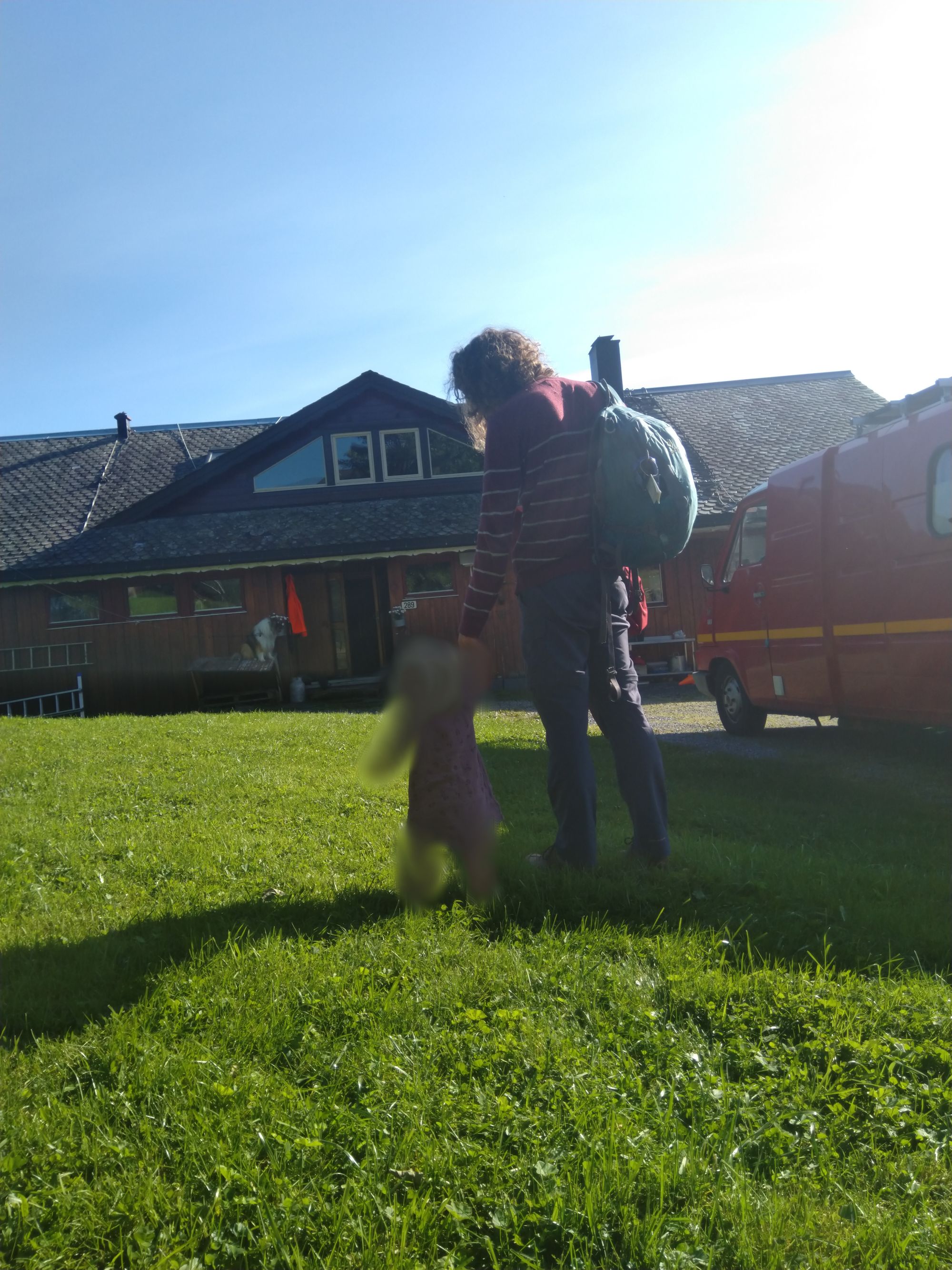 In Mo i Rana maakten we tourtje in de stad, en hadden gezellige praatjes. In Steinkjer maakten we een mooie wandeling. In Trondheim bezochten we gezellig vrienden, en toen gingen we door het binnenland, over de hoge Strynnefjellet, terug naar Stårheim. Een halfuur voor de bestemming, begaf onze luchtvering het. Het was zondagavond, en we haalden nog net een bushalte langs de weg. Het leek erop dat er geen bussen zouden komen, dus hebben we daar maar overnacht. Wat berichtjes later, bleek dat we best voorzichtig konden doorrijden - gelukkig! Dat werd de volgende morgen, en we kwamen heelhuids aan op de boerderij. Dat was een goed weerzien!
